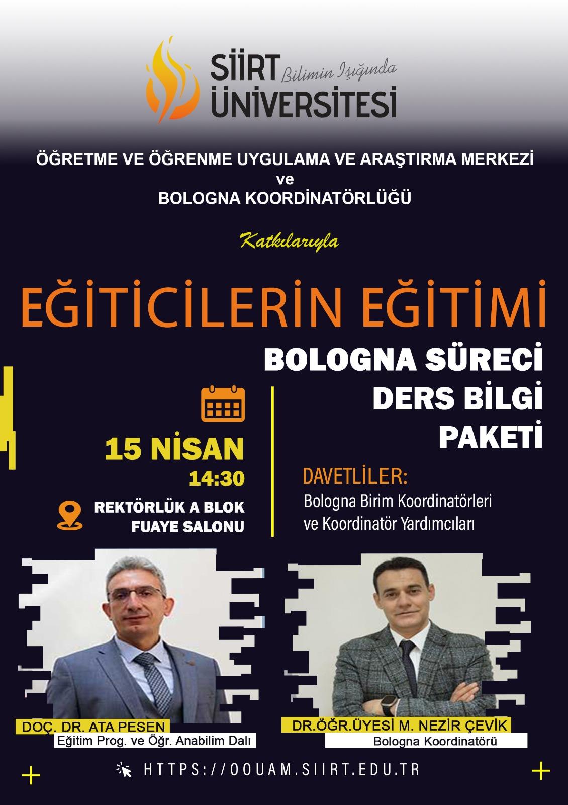 Birim Koordinatör ve Koordinatör yardımcılarına Bologna Süreci Ders Bilgi Paketi hakkında Eğiticilerin Eğitimi adı altında 15/05/2026 tarihinde saat 14.30 da Rektörlük Fuaye Salonunda program düzenlenecektir.
